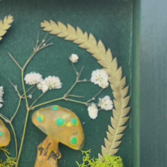 Each piece features delicately sculpted resin mushrooms, surrounded by real preserved moss, flower pods, and airy baby’s breath, creating a scene that feels like a tiny world frozen in time. The natural textures and organic elements are carefully arranged to evoke the quiet magic of nature.